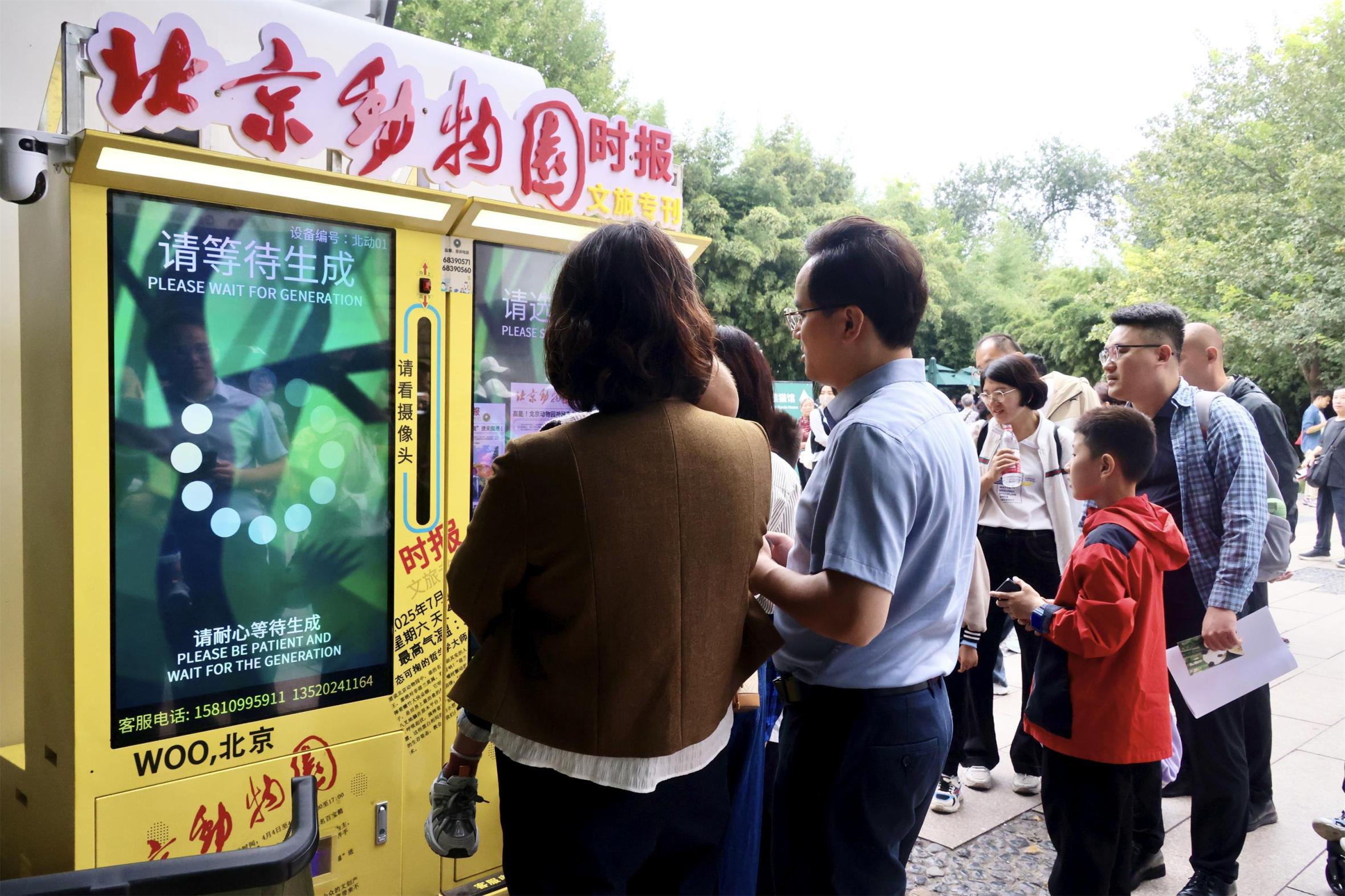 在北京动物园铜虎雕塑广场旁,“国潮北动·双节同欢”文创市集汇聚了文创爆款、特色美食和非遗手作体验,吸引众多游客参与互动。大熊猫旗舰店、鹈鹕商店等文创商店也推出多款“国庆限定”和“动物萌趣”文创产品。其中,“祝福祖国”文创冰箱贴成为今年国庆假期的“爆品”,而兼具创意与收藏价值的“北京动物园时报”更是成为时尚单品,游客纷纷获取属于自己的专属时报。